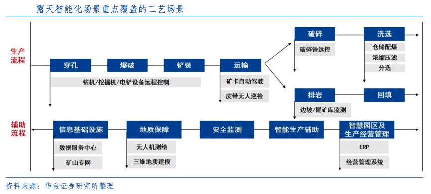 經典案例:根據華金證券研究所等綜合資訊表明,北路智控針對露天煤礦,重點提升礦井網絡、數據中心、感知系統建設,重點建設遠程操控系統、無人駕駛系統、遠程運維系統等,實現開采環境數字化、采掘裝備智能化、生產過程遙控化、信息傳輸網絡化和經營管理信息化。