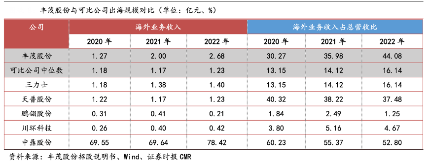 經典案例:根據豐茂股份招股書、wind、證券時報CMR等資訊表明,豐茂股份公司作為橡膠傳動帶行業龍頭之一,其橡膠帶傳動系統產品在市場中具有較高的美譽度、知名度和明顯的競爭優勢,先后榮獲“優秀供應商”、“質量信得過供應商”、 “傳動帶行業八強企業”等榮譽。據招股書披露,公司出海規模居可比公司前列,2020-2022 年出海規模逐年遞增, 2022 年達到 2.68 億元,2020-2022 年公司海外營收貢獻度穩定增長,2022 年達到44.08%。