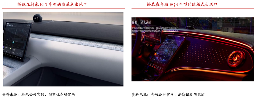 經典案例:根據蔚來公司官網、奔馳公司官網、浙商證券研究所等綜合資訊表明,香山股份探索創新新型出風口,個性化定制契合車型。為了加強公司在空氣管理系統行業的核心競爭力,緊跟新能源汽車行業發展,公司不斷拓展產業布局,開發新的產品,如隱藏式出風口、無感風出風口、貫穿氛圍燈出風口等 項目,致力實現人與座艙的智能交互。