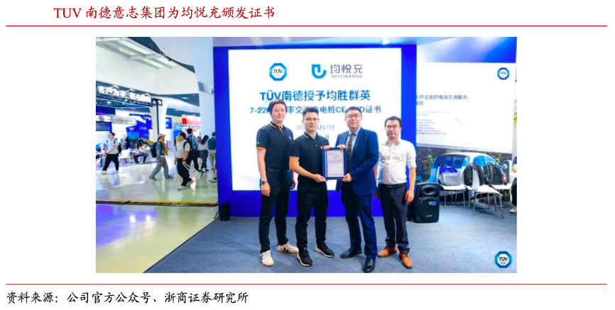經(jīng)典案例:根據(jù)公司官方公眾號(hào)、浙商證券研究所等綜合資訊表明,均悅充旗下“均悅·享”智能交流樁、隨車充等多產(chǎn)品在 2022 年獲得歐標(biāo)認(rèn)證,為進(jìn)軍歐洲市場(chǎng)提 供基礎(chǔ)。2023 年 6 月 7 日,均悅充旗下 7-22kW 功率交流充電樁(歐標(biāo))獲得了 TUV 南德 意志集團(tuán)頒發(fā)的“TUV 南德安全認(rèn)證”及“CE-RED”證書,再一次證明了公司的研發(fā)實(shí) 力,彰顯產(chǎn)品核心競(jìng)爭(zhēng)力。