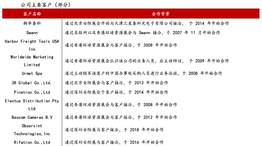 經典案例:根據公司招股說明書、方正證券研究所等綜合資訊表明,安聯銳視產品主要應用于消費級市場,目前已廣泛覆蓋眾多海外頭部品牌。公司的銷售客 戶主要為消費類安防視頻監控產品銷售商,包括 Swann、Harbor Freight Tools 等品牌運營商。其中,Swann 是全球民用安防監控產品領先品牌,以 DIY 產品為 主,產品主要銷往美國、歐洲、大洋洲等市場。