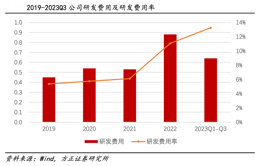 經典案例:根據wind、方正證券研究所等綜合資訊表明,安聯銳視持續加大研發投入,不斷豐富產品品類。2023前三季度,公司的研發費用為 0.64 億元,研發費用率達到了 13.25%,同比提升了 3.22 個百分點。在安防逐漸轉向 智能化、網聯化、高清化的背景下,2023 年前三季度,公司針對專業安防產品線 公司研發了 4 路 4K 智能全景攝像機;針對消費類產品線研發了 4K 低功耗超距智 能攝像機套裝。