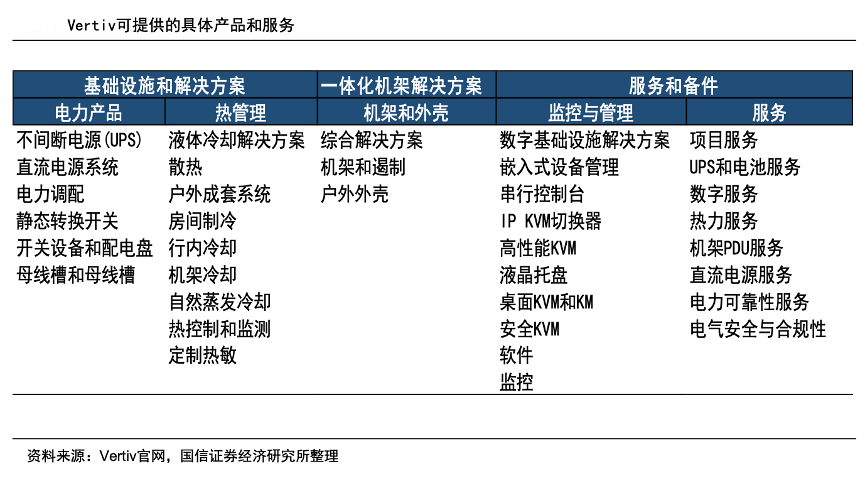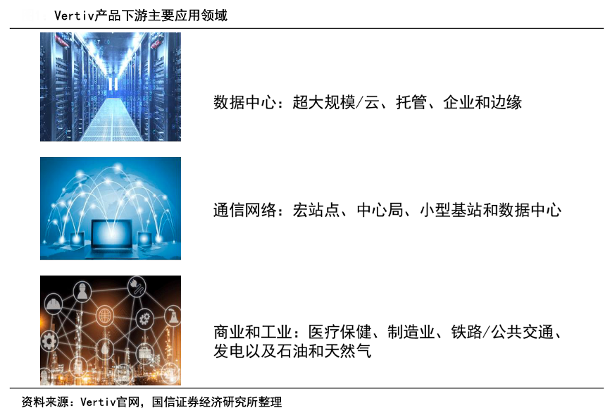 經典案例:根據Vertiv官網、國信證券經濟研究所等綜合資訊表明,Vertiv公司業(yè)務圍繞電力、冷卻和IT管理展開,下游主要涉及數據中心、通信網絡以及商業(yè)和工業(yè)環(huán)境三大領域。公司主要提供從云到網絡邊緣的電力、冷卻和IT基礎設施解決方案和服務,具體產品包括基礎設施和解決方案(交流和直流電源管理、熱管理、低/中壓開關設備、母 線槽和集成模塊化解決方案)等。