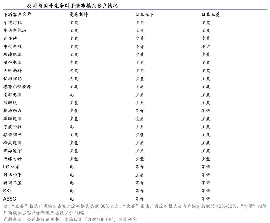 經(jīng)典案例:根據(jù)公司招股說明書問詢函回復(fù)、華泰研究等綜合資訊表明,曼恩斯特公司涂布模頭自 2017 年開始逐步替代進(jìn)口品牌,目前公司覆蓋了動(dòng)力鋰電池全球排行前十的絕大多數(shù)優(yōu)質(zhì)客戶資源,并與國內(nèi)外知名 3C 數(shù)碼鋰電企業(yè)、鋰電設(shè)備制造商建立了合作。在動(dòng)力和儲(chǔ)能鋰電池領(lǐng)域,公司與寧德時(shí)代、 LG 新能源、比亞迪、中創(chuàng)新航、國軒高科、億緯鋰能等國內(nèi)外知名企業(yè)建立了穩(wěn)定的合作關(guān)系。