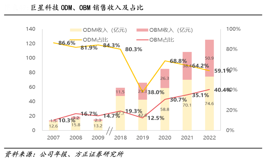 經(jīng)典案例:根據(jù)公司年報(bào)、方正證券研究所等綜合資訊表明,巨星科技為全球手工具產(chǎn)品的龍頭企業(yè),早期公司以 ODM 商業(yè)模式起家,目前公司仍然主要采用 ODM 的經(jīng)營(yíng)模式,但同時(shí) OBM 的銷售金額逐年上升。2022 年公 司 ODM(客戶品牌)占比為 59.14%,OBM(自有品牌)收入占比上升至 40.35%。
