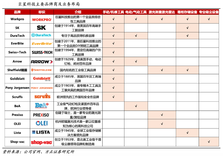 經(jīng)典案例:根據(jù)公司官網(wǎng)、方正證券研究所等綜合資訊表明,目前,巨星科技公司已擁有多個(gè)全球知名百年品牌和工具細(xì)分行業(yè)龍頭品牌,涵蓋業(yè)務(wù)有手動(dòng)工具、電動(dòng)工具、氣動(dòng)緊固工具、激光測(cè)量工具、激光雷達(dá)、箱柜存儲(chǔ)設(shè)備、 工業(yè)吸塵器等。