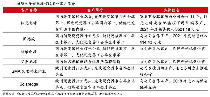 經典案例:根據《發行人及保薦機構回復意見(2021年年報財務數據更新版》、西部證券研發中心等綜合資訊表明,在新能源領域,維峰電子公司產品主要應用在 太陽能、風能和儲能逆變系統,對應客戶包括陽光電源、固德威、錦浪科技、艾羅能源、 SMA、Solaredge 等逆變器及其他配件廠商。公司與國內主要新能源企業合作多年。2020 年合肥鑫碩(陽光電源向公司采購連接器的貿易商)、固德威兩家企業占公司新能源業務 約 90%,公司與合肥鑫碩合作 11 年,與固德威合作 7 年,客戶關系穩固。。
