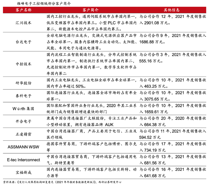 經典案例:根據《發行人及保薦機構回復意見(2021年年報財務數據更新版)》、西部證券研發中心等綜合資訊表明,維峰電子公司通過持續深耕和銷售策略聚焦才逐步形成數量可觀的客戶量,大部分工控領域主要客戶與公司合作均超過 10 年。其中匯川技術作為國內工控行業龍頭,公司是其工業控制領域連接器第一大國產供應商。公司在工控領域的核心終端客戶主要為匯川技術、臺達電子、中控技術等,品牌商客戶主要包括泰科、Würth 集團等。2022 年以來, 公司持續突破珠海松下、天津霍尼韋爾等海外新客戶,2023 年進一步突破西門子,并形成批量化出貨。