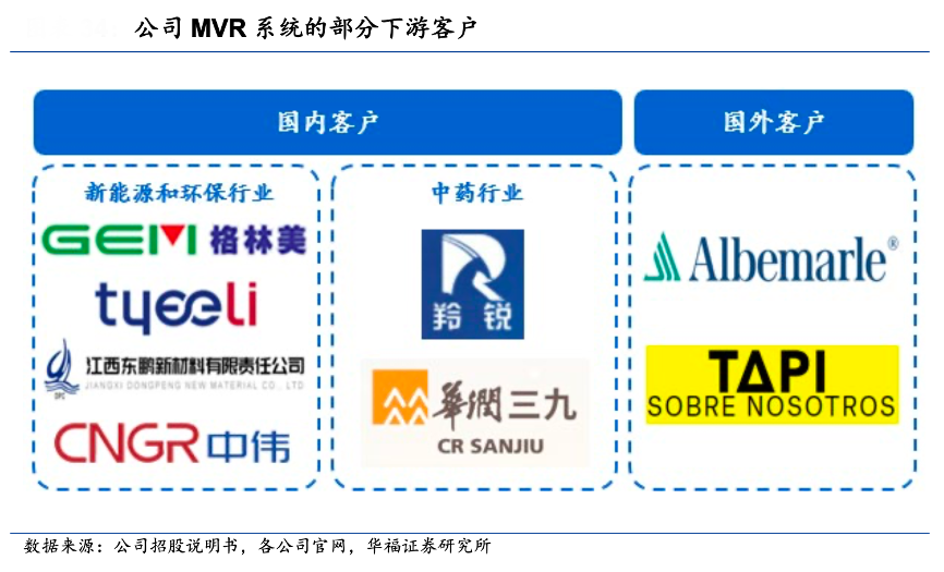 經典案例:根據公司招股說明書、各公司官網、華福證券研究所等綜合資訊表明,亞光股份公司的 MVR 系統在新能源、環保、中藥行業的應用案例豐富, 已順利服務格林美、羚銳制藥、華潤三九、Albemarle Lithium Pty Ltd 等國內外龍頭,由于 MVR 系統屬于高度定制化裝備,因此客戶一旦選中供應商一般不會輕易更換,公司已積累的客戶有望具備較強粘性。