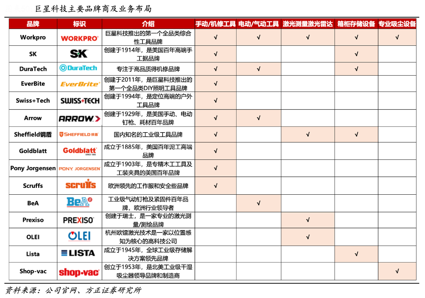 經典案例:根據公司官網、方正證券研究所等綜合資訊表明,目前,巨星科技公司已擁有多個全球知名百年品牌和工具細分行業龍頭品牌,涵蓋業務有手動工具、電動工具、氣動緊固工具、激光測量工具、激光雷達、箱柜存儲設備、工業吸塵器等。