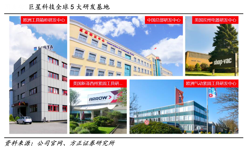 經典案例:根據公司官網、方正證券研究所等綜合資訊表明,巨星科技公司擁有全球化的研發中心。目前,公司在全球有五大研發基地,分別是中國總部研發中心、美國賓州電器研發中心、美國新澤西州緊固工具 研發中心、歐洲工具箱柜研發中心、歐洲氣動緊固工具研發中心。