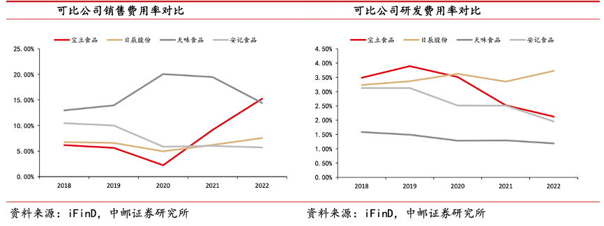 經典案例:根據iFinD、中郵證券研究所等綜合資訊表明,寶立食品公司主要客戶為百勝中國、麥當勞等餐飲行業巨頭,因此公司在營銷等方面的投入較少。2021 年起公司銷售費用率出現大幅上升的主要原因是收購空刻后為宣傳產品在營銷端進行大量投入,2022 年公司銷售費用率為 15.25%,與主營 C 端的天味接近。公司為滿足大B 客戶較高頻率的產品更新迭代需求,公司在產品研發端投入較高。2022 年公司研發費用率為 2.13%,僅次于日辰股份。