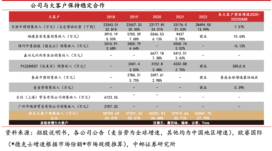 經典案例:根據招股說明書、各公司公告、歐睿國際、中郵證券研究所等綜合資訊表明,寶立食品公司與大 B 端客戶合作穩定,前五大客戶名單變動較小,其中百勝中國、圣農發展、PIZZAVEST(達美樂)常年位居前五,且百勝中國長期穩居第一。根據 2020-2022 年前五大客戶復合增速看,百勝、麥當勞擴店穩健,達美樂近 3 年發展迅速增速達 35.3%,泰森中國和圣農發展在預制菜領域也有較好表現。