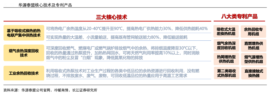 經典案例:根據華源泰盟公司官網、冷暖商情、長江證券研究所等綜合資訊表明,華源泰盟擁有三大核心技術和8 大類專利產品,可以在提高熱電廠和工業余熱設施的供熱能力的同時,減低能耗,減少氮氧化物等污染物的排放,解決當前低品位余熱利用中的痛點。