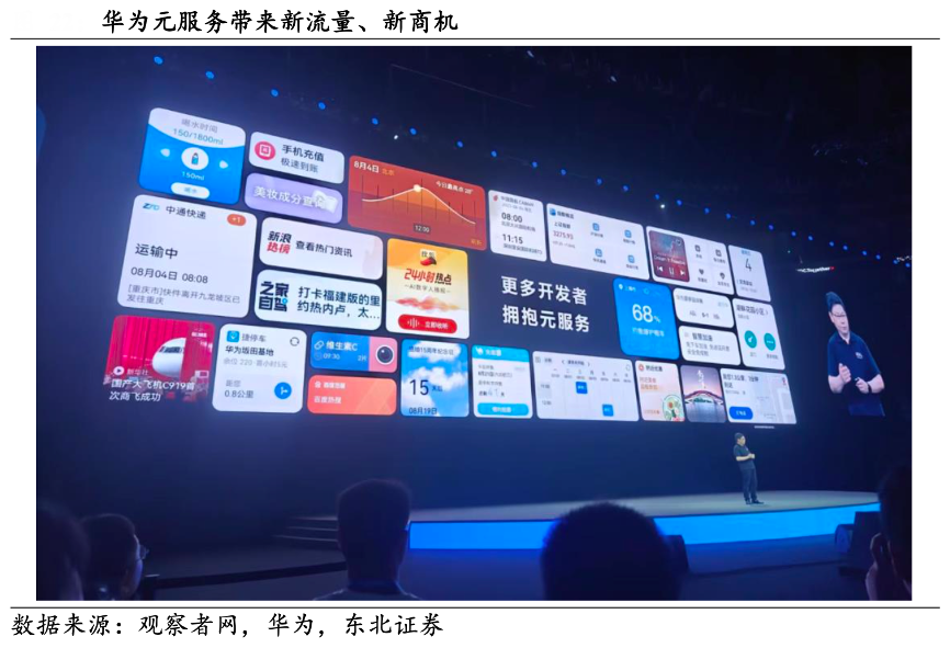 經典案例:根據觀察者網、華為、東北證券等綜合資訊表明,鴻蒙生態服務分發,給合作伙伴帶來新流量。在華為開發者大會,余承東透露,在基于鴻蒙操作系統開發元服務后,僅半年時間,新浪財經用戶活躍度增長了 6 倍;喜馬拉雅的用戶活躍度增長了11倍;華為音樂活躍用戶數也增長了 3 倍;藥管家在 使用小藝智能推薦后,單月新增用戶達千萬級。