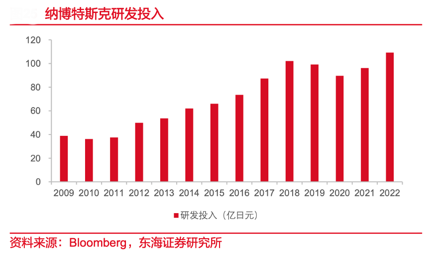 經(jīng)典案例:根據(jù)Bloomberg、東海證券研究所等綜合資訊表明,納博特斯克始終強(qiáng)調(diào)研發(fā),公司“Vision 2030”戰(zhàn)略規(guī) 劃中明確提出在增強(qiáng)現(xiàn)有產(chǎn)品競(jìng)爭(zhēng)力的同時(shí)超前布局新一代產(chǎn)品。2022 年公司研發(fā)投入達(dá) 109.2 億日元,近五年累計(jì)研發(fā)費(fèi)用投入近 500 億日元,重點(diǎn)開(kāi)發(fā)新一代精密減速器、自動(dòng) 門、飛行控制系統(tǒng)、鐵路運(yùn)輸設(shè)備等核心產(chǎn)品。