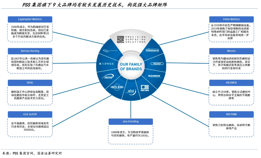 經典案例:根據PSS集團微信公眾號、國金證券研究所等綜合資訊表明,美國 PSS(Precision Surfacing Solutions)集團,作為全球最大的超精密機床生產制造商之一,旗下擁有來自于德國、瑞士、美 國、英國及荷蘭的多個百年品牌。集團產品涵蓋了半導體晶圓設備、多線切割設備、研磨、 拋光、雙端面磨床、強力成形磨、平面成形磨、去毛刺機、立式磨削中心、葉尖磨、內外圓磨及耗材。為全球超過 9000 個客戶提供精密加工解決方案。
