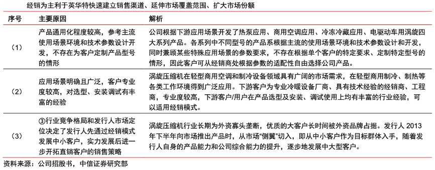 經(jīng)典案例:根據(jù)公司招股書、中信證券研究部等綜合資訊表明,英華特通過參加經(jīng)銷商產(chǎn)品推介與技術交流會、與經(jīng)銷商工程師對接溝通等方式,與終端客戶保持緊密聯(lián)系,加深對行業(yè)需求理解,及時感知行業(yè)變化趨勢,適時進行技術升級,開展前瞻性研發(fā)。截至 2022 年年底,公司已 在全國發(fā) 37 家境內(nèi)經(jīng)銷商,初步建立一個覆蓋華東、華北、華南地區(qū)的經(jīng)銷網(wǎng)絡。