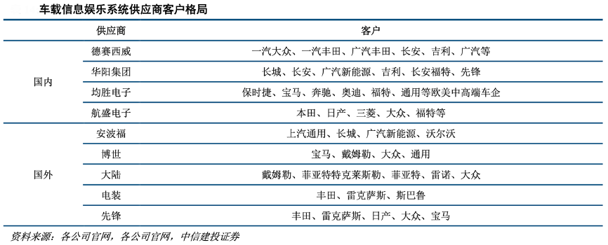經(jīng)典案例:根據(jù)各公司官網(wǎng)、中信建投證券等綜合資訊表明,中控國內(nèi)格局“一超多強”,華陽屬于國內(nèi)第一梯隊。華陽集團車載娛樂信息系統(tǒng)國產(chǎn)替代速度稍慢于德賽西威,但仍處于國內(nèi)第一梯隊,目前以 長城汽車為基本盤,積極向長安、吉利、廣汽等優(yōu)勢自主拓展。
