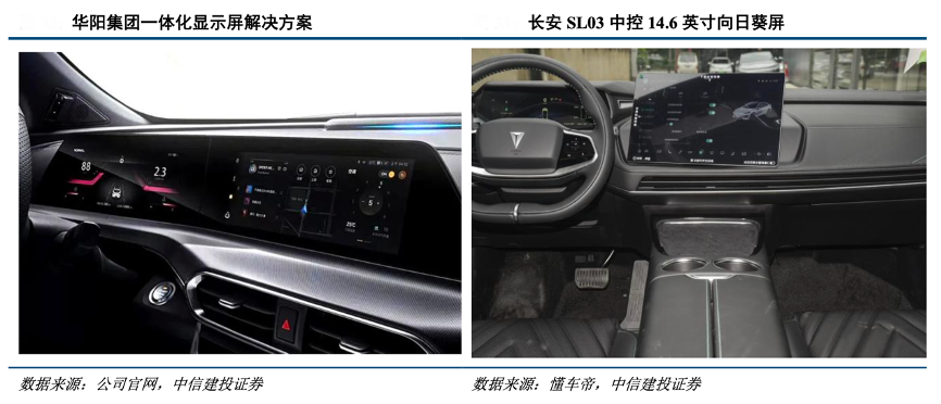 經(jīng)典案例:根據(jù)公司官網(wǎng)、懂車帝中信建投證券等綜合資訊表明,華陽集團公司推出了從 10.25 到 27 寸多尺寸組合一體化顯示屏解決方案,還可以為 客戶靈活定制,如使用曲面屏、異形屏等,比如為長安 SL03 車型提供 14.6 英寸的中控向日葵屏作為該車型的 一大賣點,具有左右最大 15°的旋轉(zhuǎn)功能,在智能模式下顯示屏能夠隨場景自動執(zhí)行偏轉(zhuǎn)運動,可實現(xiàn)迎送賓場景、倒車場景的自動偏轉(zhuǎn),偏轉(zhuǎn)角度可通過語音控制。