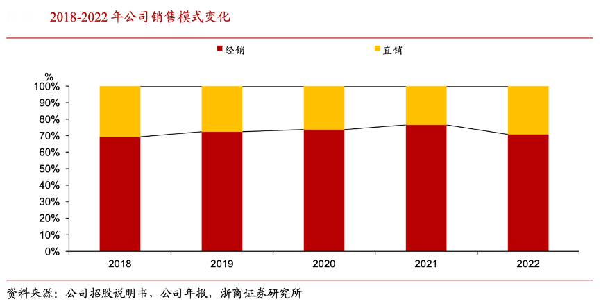 經典案例:根據公司招股說明書、公司年報、浙商證券研究所等綜合資訊表明,禾川科技公司采用“經銷為主,直銷為輔” 的銷售模式,對普通客戶通過經銷商銷售產品,對部分采購量大、產品個性化要求較高的 戰略客戶,則采取直銷模式。2018-2021 年,公司實施行業聚焦戰略,通過經銷商渠道開拓鋰電、光伏等行業重要終端客戶,經銷比例持續上升。