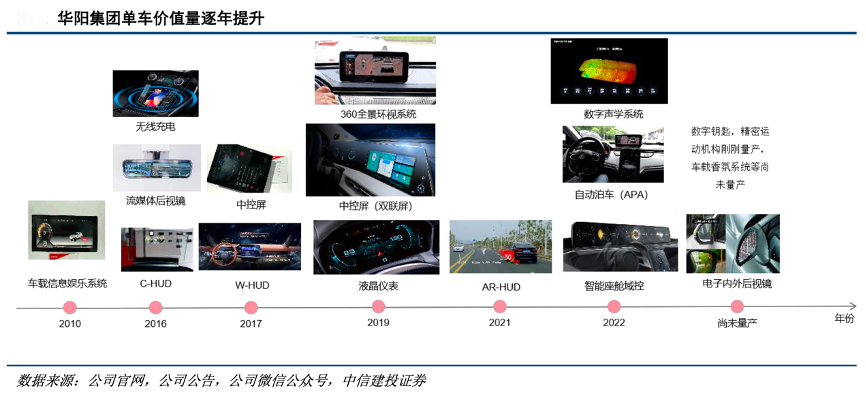 經(jīng)典案例:根據(jù)公司公告、公司官網(wǎng)、公司微信公眾號、中信建投證券等綜合資訊表明,華陽從車機到中控屏/液晶儀表再到 HUD,座艙產(chǎn)品不斷拓展提升單車價值量。2022年華陽量產(chǎn)了智能座艙域控,實現(xiàn)了中控的升級,搭載于長城的哈弗 H6 和坦克 300。同年,華陽還量產(chǎn) 了數(shù)字聲學(xué)、數(shù)字鑰匙和精密運動機構(gòu)等產(chǎn)品。