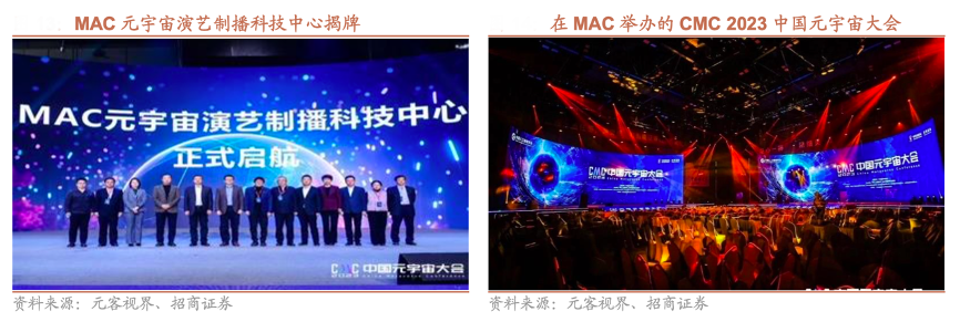 經典案例:根據元客視界、招商證券等綜合資訊表明,Meta Arts Center (簡稱 MAC)是中國移動·咪咕和凌云光·元客視界共同承建運營的元宇宙演藝制播科技中心,是業內首個擁有光場重建、全身動作捕捉、超高清 XR+VP 虛擬制作的全棧制作服務能力的元宇宙數字內容創作基地。MAC 前身是北京冬奧會冰壺訓練館,中心擁有超 7000 m²+專業拍攝場地, 挑高 12m ,已成功承接舉辦超千人規模的 CMC 2023 中國元宇宙大會。