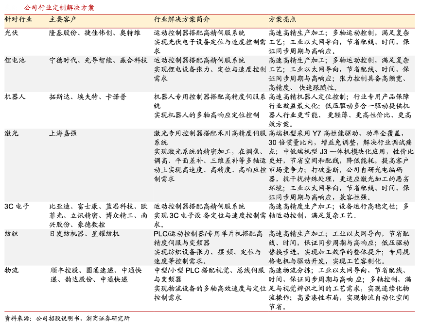經典案例:根據公司招股說明書、浙商證券研究所等綜合資訊表明,禾川科技發揮產品組合優勢,打造多場景解決方案。其充分發揮控制、驅動、傳感、 機電一 體化等產品組合優勢,在光伏、鋰電、機器人、激光等多個行業擁有深入的個性化解決方案。