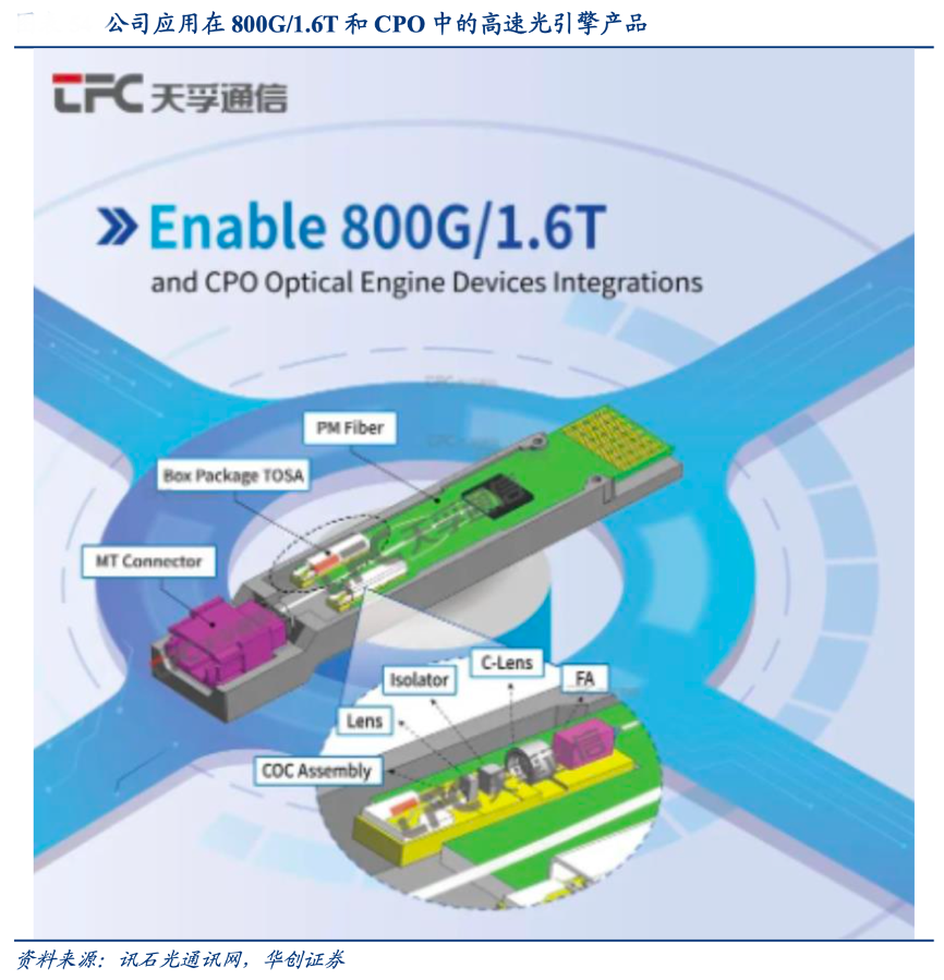 經(jīng)典案例:根據(jù)訊石光通訊網(wǎng)、華創(chuàng)證券等綜合資訊表明,天孚通信公司光引擎項(xiàng)目在 2021 年獲得海外客戶首個(gè)億元訂單,并自 2022 年開始為客戶批量交付光引擎產(chǎn)品,目前量產(chǎn)產(chǎn)品已處于穩(wěn)定批量交付狀態(tài)。