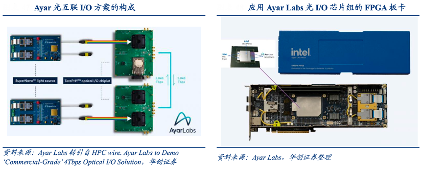 經(jīng)典案例:根據(jù)Ayar Labs、華創(chuàng)證券等綜合資訊表明,2023 年 11 月,Ayar Labs 展出集成了英特爾 Agilex FPGA 技術(shù)的封裝內(nèi)光學(xué) I/O 解決方案,TeraPHY 芯片和 F-tile 芯片及 FPGA 共同封裝。Ayar Labs 表示相較于市場(chǎng)競(jìng)品該方案帶寬提高了 5 倍,功耗降低了 5 倍,延遲降低了 20 倍。