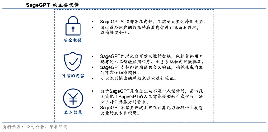 經典案例:根據公司公告、華泰研究等綜合資訊表明,第四范式于 2023 年 3 月推出專為業務場景設計的企業級生成式 AI 產品 SageGPT。SageGPT 具有多模態交互和企業級 AI 工具,它重新定義了最終用戶員工與業務系統交互的方式。