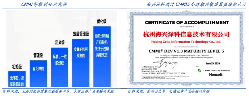 經典案例:根據上海網先高質量發展服務平臺、公司公眾號、長城證券產業金融研究院等綜合資訊表明,在軟件開發方面,海興電力全資子公司杭州海興澤科信息技術有限公司已獲得國家重點軟件企業認定,并于 2020 年獲得國際軟件成熟度模型最高級別 CMMI-5 級認證,是行業內極少數可面向全球市場提供高質量軟件集成服務的企業,標志著公司在技術研發能力等方面達到了國際頂級水平。