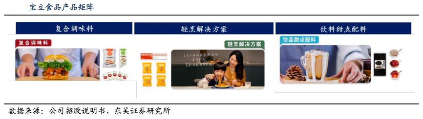 經(jīng)典案例:根據(jù)公司招股說明書、東吳證券研究所等綜合資訊表明,寶立食品公司深耕復(fù)合調(diào)味料領(lǐng)域多年,除復(fù)合調(diào)味料外,公司產(chǎn)品應(yīng)用和類別逐步拓寬,推出各式風(fēng)味的預(yù)烹飪料理包、預(yù)烹飪湯、空刻意面等輕烹解決方案以及果醬、爆珠、晶球和粉圓等多款飲品甜點(diǎn)配料。