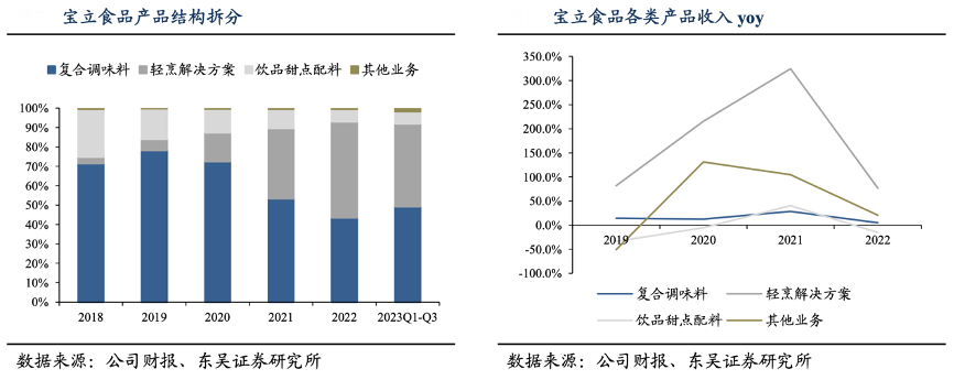 經(jīng)典案例:根據(jù)公司財報、東吳證券研究所等綜合資訊表明,寶立公司主營業(yè)務分為復調、輕烹解決方案和飲品甜點配料。2021 年公司收購廚房阿芬 75%股份后,空刻意面業(yè)務并入輕烹解決方案收入。復調和輕烹業(yè)務現(xiàn)在系公司收入兩大基石,2023Q1-3 復調、輕烹業(yè)務收入占比分別為 49%/43%。
