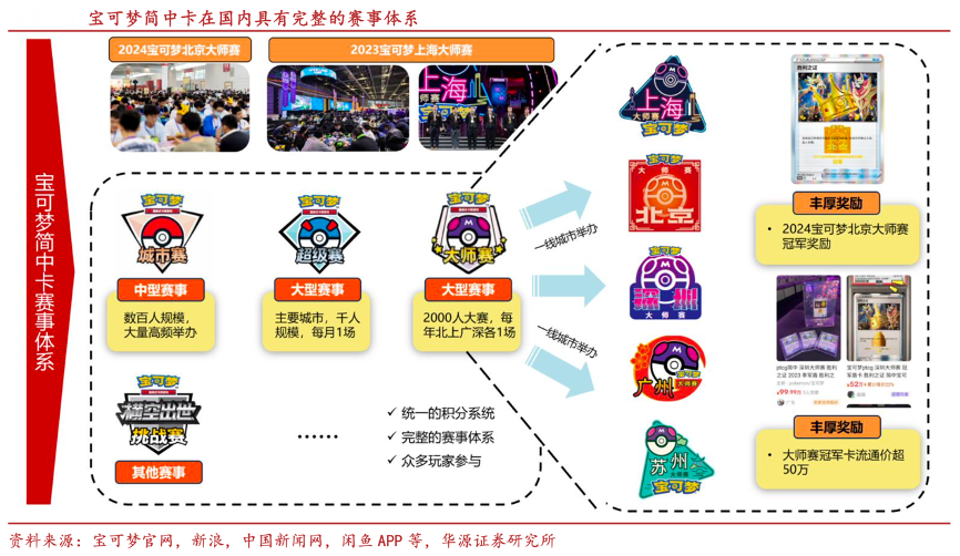經典案例:根據寶可夢官網、新浪、中國新聞網、閑魚APP、華源證券研究所等綜合資訊表明,寶可夢卡牌大力投入國內賽事,形成完備的賽事體系。2023 年,寶可夢卡牌在全國各大城市舉辦了一系列賽事,短時間內形成了完備的賽事體系。大型賽事包括超級賽和大師賽,超級賽在重點城市舉辦,如青島、廈門和成都,人數規模在千人左右,幾乎每月都有一場。大師賽每年在北上廣深各 舉辦一場,人數規模在千人以上,各地高手匯聚一堂,是最高等級的賽事。