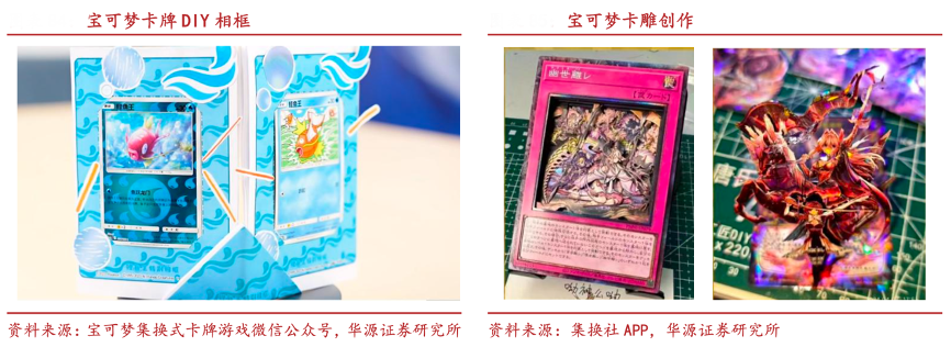 經典案例:根據寶可夢集換式卡牌游戲微信公眾號、集換社APP、華源證券研究所等綜合資訊表明,除卡牌本身外,寶可夢卡牌衍生出更加多元的藝術表達。除了卡套和收納盒等傳統的收納、展示方式外,玩家通過 DIY 的方式制作卡牌相框,亦或是基于卡牌本身的卡雕創作等。卡雕即采用卡牌作為材料,通過特殊手法做出紙浮雕的效果的手工作品。
