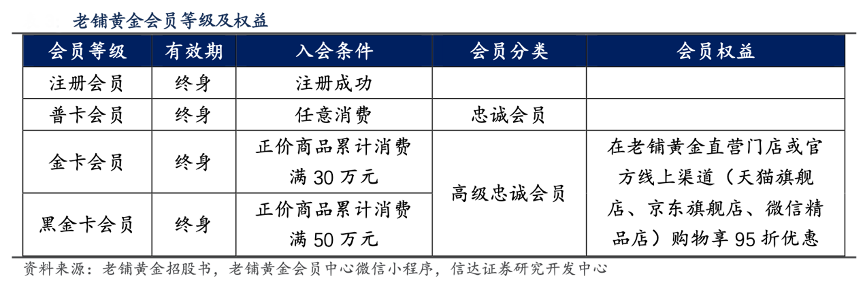經典案例:根據老鋪黃金招股書、老鋪黃金會員中心微信小程序、信達證券研究開發中心等綜合資訊表明,老鋪黃金公司會員分為四大等級,任意消費即可成為忠誠會員,累計正價商品消費金額達到 30 萬元 即為高級忠誠會員,可享受官方購買渠道 95 折的優惠權益。