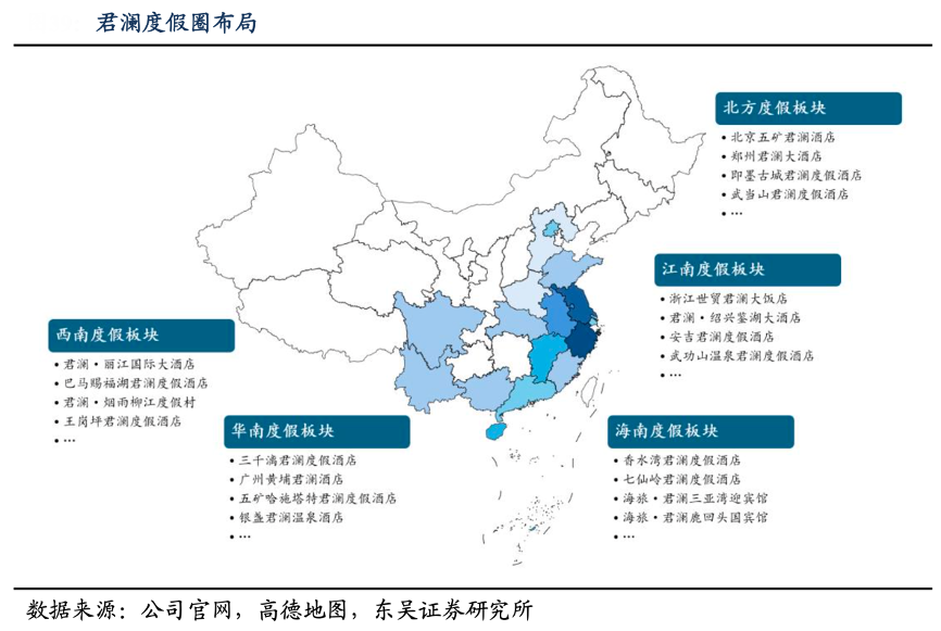 經(jīng)典案例:根據(jù)公司官網(wǎng)、高德地圖、東吳證券研究所等綜合資訊表明,君瀾依托濱海、溫泉、古城古鎮(zhèn)等優(yōu)質(zhì)旅游目的地,整合景區(qū)和物業(yè)資源,打造“四南一北”全國(guó)度假圈布局。得益于中式文化融合服務(wù)和優(yōu)質(zhì)旅游資源整合,君瀾已形成國(guó)內(nèi)規(guī)模最大、門類最齊全的大型度假酒店運(yùn)營(yíng)商,在新增項(xiàng)目數(shù)量、資源性項(xiàng)目占領(lǐng)上具備領(lǐng)先優(yōu)勢(shì),引領(lǐng)高端度假行業(yè)發(fā)展。