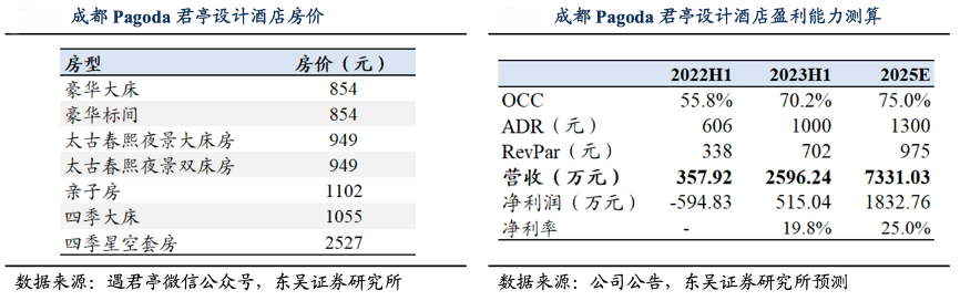 經(jīng)典案例:根據(jù)公司公告、遇君亭微信公眾號(hào)、東吳證券研究所等綜合資訊表明,成都 Pagoda 開業(yè)以來(lái)獨(dú)特的設(shè)計(jì)風(fēng)格吸引大量顧客 打卡,小紅書上成都 Pagoda 酒店 tag 熱度達(dá) 17 萬(wàn)次瀏覽。2023 年 H1,成都 Pagoda 實(shí) 現(xiàn)營(yíng)業(yè)收入 2596.24 萬(wàn)元,RevPAR 為 702 元,同比+108%,凈利潤(rùn)為 515.04 萬(wàn)元,凈 利率為 19.8%。