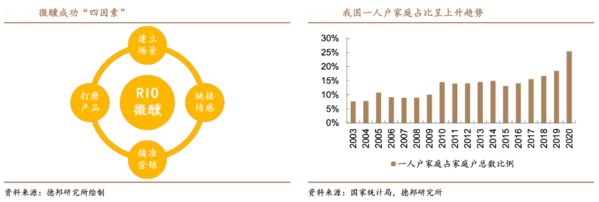 經典案例:根據國家統計局、德邦研究所等綜合資訊表明,對比RIO經典瓶系列倡導以分享為核心的聚會場景,微醺瞄準的是年輕人一個人時的獨飲場景。RIO從“大部分年輕人在工作日的獨處時間比派對、聚會場景更多,出現的頻次也更高”的觀察出發,將微醺定位為“一個人的小酒”,突出飲用微醺的日常感。飲用場景的獨特定位為微醺開辟了廣闊的空白市場。
