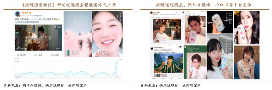 經典案例:根據周冬雨微博、快消銳觀察、德邦研究所等綜合資訊表明,微醺在宣傳上更注重通過多元化載體引導消費者對獨飲場景的認知。2018 年 5 月至 2021 年 5 月,由周冬雨演出的多部微 電影分別結合 “一個人的小酒”、“一人微醺的快樂,是一人以上無法 體會的”等關鍵詞條進行宣傳,圍繞戀愛、職場等緊扣年輕人生活的主 題展開,反復強化在家中一人獨飲微醺的場景印象,在多個平臺引起廣泛關注。RIO 多次邀請王一 博、魏大勛等一眾當紅明星參與助陣,讓微醺觸及眾多“粉絲圈”。