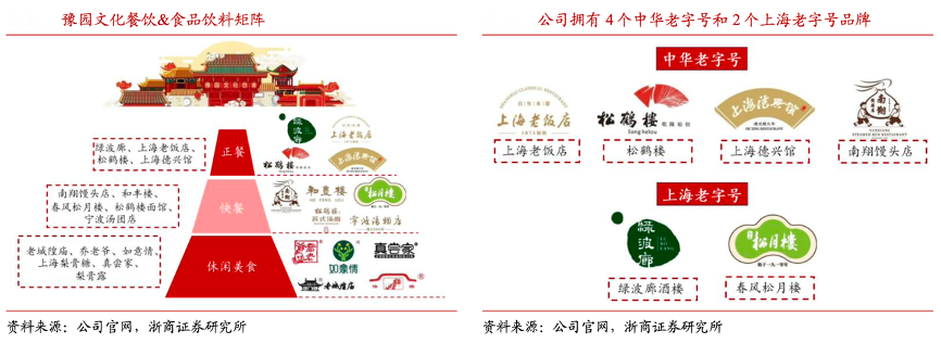 經典案例:根據公司官網、浙商證券研究所等綜合資訊表明,豫園股份公司文化餐飲業務名列全國餐飲行業前 60 強,主營正餐、休閑餐飲、美食廣場和潮流娛樂等業態,旗下擁有一批上海市著名商標、百年中華老字號,其中包括 4 個中華老字號——南翔饅頭店、上海老飯店、上海德興館、松鶴樓;和 2 個上海老字號——綠波廊、春風松月樓。