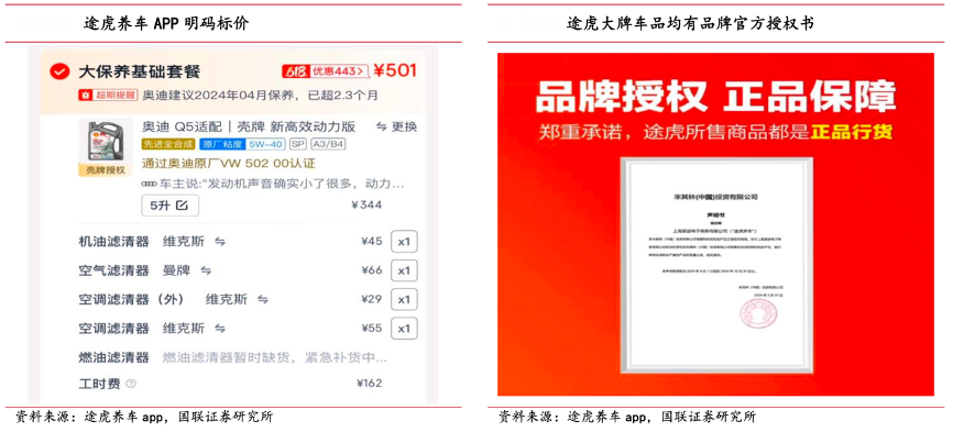經(jīng)典案例:根據(jù)途虎養(yǎng)車app、國(guó)聯(lián)證券研究所等綜合資訊表明,途虎的線上銷售預(yù)約+線下標(biāo)準(zhǔn)化服務(wù)的創(chuàng)新養(yǎng)車模式上解決了傳統(tǒng) IAM 產(chǎn)品/服務(wù)價(jià)格不透明的痛點(diǎn),也省 去了討價(jià)還價(jià)的過程,用戶通過線上 app 可以詳細(xì)了解所有項(xiàng)目的具體收費(fèi)情況。此外用戶通過 APP 綁定愛車后,系統(tǒng)會(huì)根據(jù)車型推薦適合的配件,相較于綜合網(wǎng)購(gòu)平臺(tái)節(jié)省了產(chǎn)品橫線對(duì)比時(shí)間。在產(chǎn)品方面,途虎在售的大牌車品均有品牌的官方授權(quán)書。