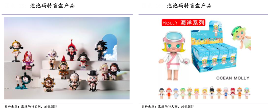 經典案例:根據公司數據、浦銀國際等綜合資訊表明,泡泡瑪特的產品主要以盲盒為主。相較其他潮玩產品,盲盒為消費者帶來神秘感,激發消費者對未知的探索與好奇心,同時在拆盲盒的過程中為消費者帶來較強的互動性購物體驗;在抽中稀缺產品后,為消費者帶來驚喜感以及滿足感。泡泡瑪特目前在中國潮玩的盲盒領域是絕對的領導者,具有壟斷地位。