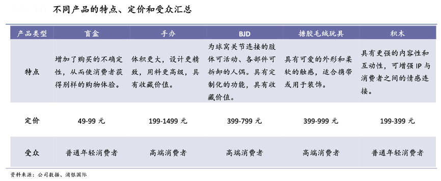 經典案例:根據泡泡瑪特官網、泡泡瑪特天貓、浦銀國際等綜合資訊表明,過去幾年里,泡泡瑪特在盲盒的基礎上不斷拓展自己的潮玩產品品類,形成更豐富的產品組合。此舉不僅能夠更多元化地來展現和提升藝術家 IP 的內 涵,也能夠拓寬消費者對潮玩產品更多的場景需求,比如收藏需求、裝飾需求、陪伴需求、出行需求等。