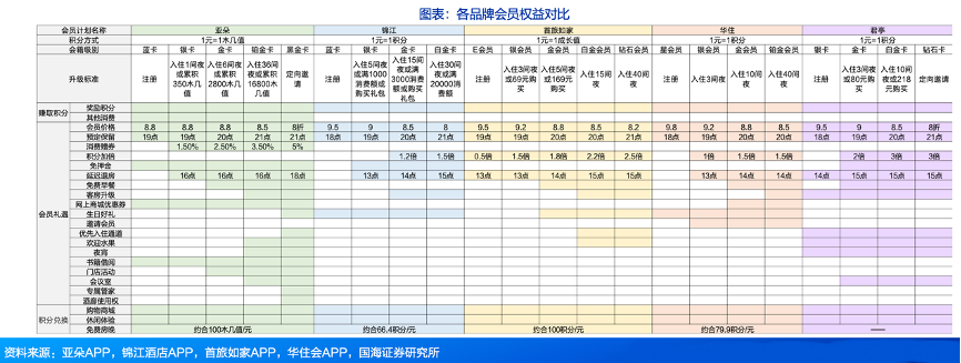 經(jīng)典案例:根據(jù)亞朵APP、錦江酒店APP、首旅如家APP、華住會(huì)APP、國(guó)海證券研究所等綜合資訊表明,亞朵A-Card會(huì)員權(quán)益跳出傳統(tǒng)酒店場(chǎng)景,延伸至出行、閱讀、會(huì)議、餐飲以及新零售等多個(gè)生活場(chǎng)景,可滿足更多元的消費(fèi)需求。亞朵的A-Card會(huì)員除會(huì)員積分、 會(huì)員價(jià)格、預(yù)定保留、延遲退房等傳統(tǒng)酒店權(quán)益外,還可以享受多項(xiàng)區(qū)別于其余四家酒店會(huì)員的獨(dú)特禮遇,如書(shū)籍借閱、門店活動(dòng)、會(huì)議室、專屬管家、酒廊使用權(quán) 等。