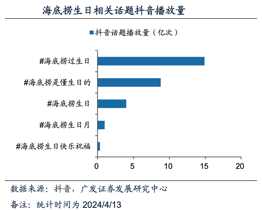 經(jīng)典案例:根據(jù)抖音、廣發(fā)證券發(fā)展研究中心等綜合資訊表明,在海底撈過(guò)生日已成為別具特色的消費(fèi)符號(hào),在各社交平臺(tái)上具有較高熱度,屢屢出圈。截至2024年4月13日,抖音“海底撈過(guò)生日”話題播放量達(dá)14.9億次,“海底撈是懂生日的”話題播放量達(dá)8.8億次。
