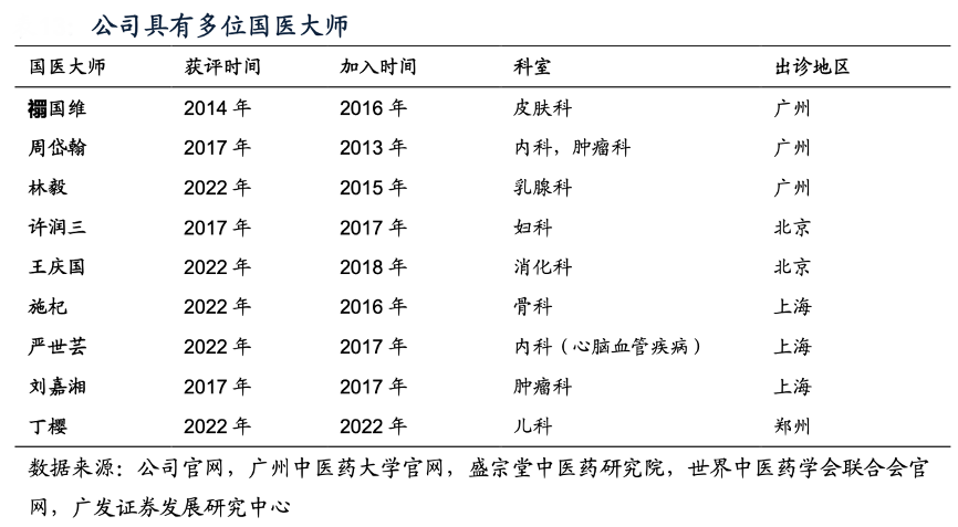 經(jīng)典案例:根據(jù)公司官網(wǎng)、廣州中醫(yī)藥大學(xué)官網(wǎng)、盛宗堂中醫(yī)藥研究院、世界中醫(yī)藥學(xué)會(huì)聯(lián)合會(huì)官網(wǎng)、廣發(fā)證券發(fā)展研究中心等綜合資訊表明,國(guó)醫(yī)大師起到學(xué)術(shù)帶頭人的作用,使固生堂獲得更多有志之士的追隨,截至2022年12月31日,固生堂在全國(guó)共擁有9名多點(diǎn)執(zhí)業(yè)的國(guó)醫(yī)大師,數(shù)量排名第一。