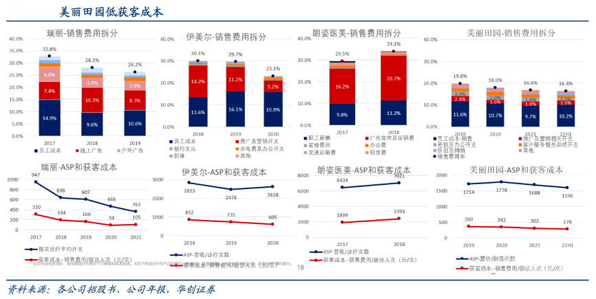 經典案例:根據各公司招股書、公司年報、華創證券等綜合資訊表明,當前雙美模式下,美麗田園公司營銷費用率低于 20%,明顯低于大多醫美機構,體現公司精準獲客以 及渠道復用的價值和會員資產價值。從銷售費用拆分來看,美麗田園投放費用率顯著低于瑞麗、伊美爾、朗姿等醫美機構,美麗田園的推廣及營銷相關開支占比約2%;費用主要為員工成本,系生美渠道的銷售顧問。