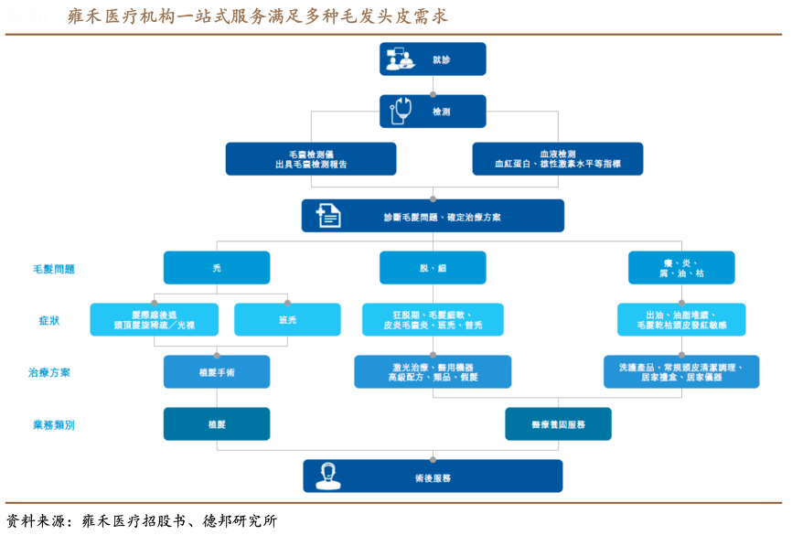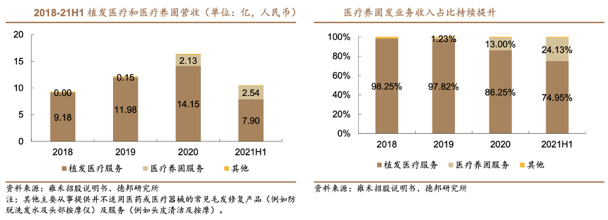 經(jīng)典案例:根據(jù)雍禾醫(yī)療招股書、德邦研究所等綜合資訊表明,毛發(fā)醫(yī)療服務(wù)市場 分為植發(fā)醫(yī)療服務(wù)市場和醫(yī)療養(yǎng)固服務(wù)市場,雍禾醫(yī)療公司于 2017 年收購史云遜健發(fā)中心,開始布局醫(yī)療養(yǎng)固服務(wù)市場,2018 年開始在植發(fā)機構(gòu)中建立“館中館”史云遜建發(fā)中心,提供醫(yī)療養(yǎng)固服務(wù)。雍禾主營業(yè)務(wù)仍舊是植發(fā)醫(yī)療服務(wù),但醫(yī)療養(yǎng)固 服務(wù)營業(yè)收入占比呈現(xiàn)上升趨勢,2019 年雍禾醫(yī)療的植發(fā)醫(yī)療服務(wù)和醫(yī)療養(yǎng)固服務(wù)營業(yè)收入分別為 11.98 億元和1,500 萬元人民幣。